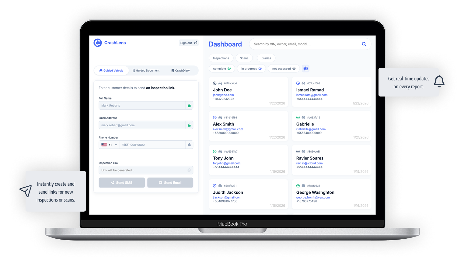 Through CrashLens™, create and send a link to your clients so they can access the guided self-inspection on their phone. With it connected to your CRM, it is easy as clicking a button.